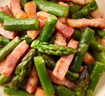 ベーコンが焼けたら、アスパラガスを加えてさらに炒めます。アスパラガスが鮮やかな緑色になったら、塩とこしょうで味を整えます。